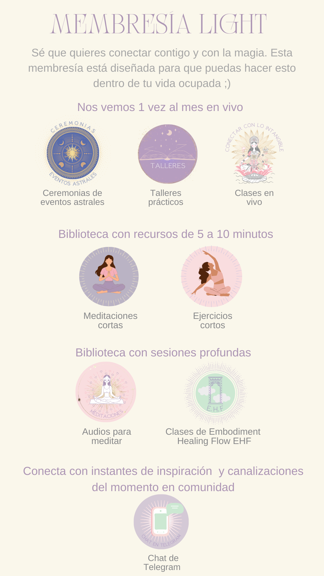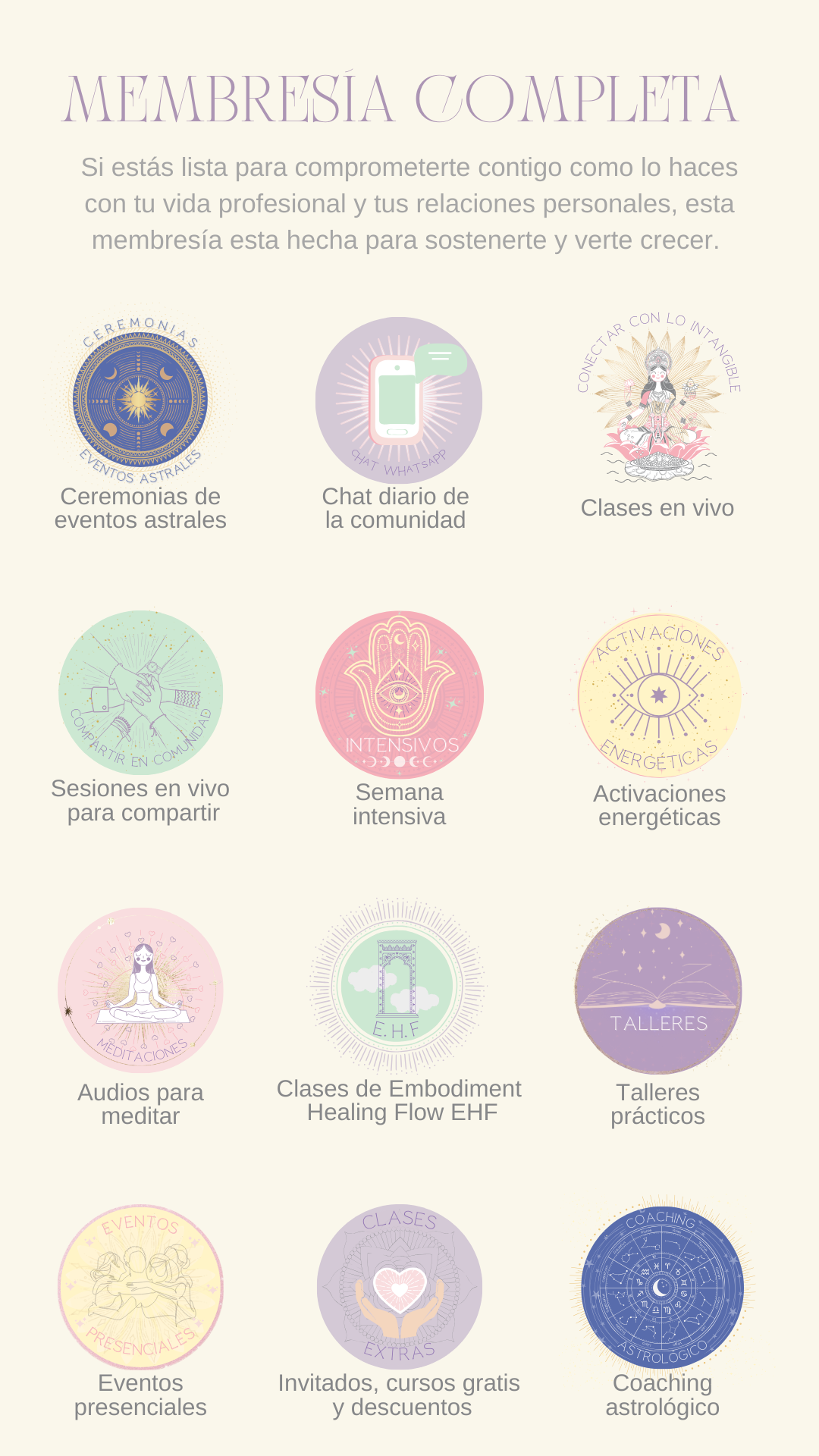 🌟 Acceso a la biblioteca completa: Meditaciones, Embodiment Healing Flow, cursos, talleres y clases disponibles en un solo lugar.
